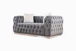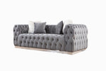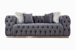 Bring a touch of Hollywood glamour to your home with the California Sofa Suite. Its distinctive Chesterfield deep buttoned detailing and ultra-soft Moroccan velvet upholstery exude sophistication. The chrome metal legs add a modern twist. Available in many different fabrics and colours